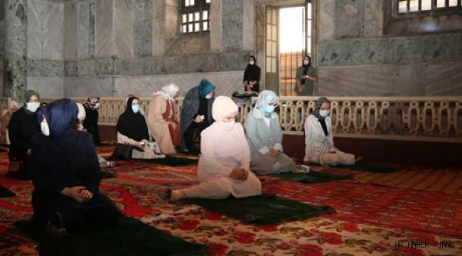Ayasofya-i Kebir Cami-i ?erifi'nin a?l??? dolay?s?yla k?l?nan ilk Cuma namaz?na kad?nlar, kendileri iin ayr?lan alandan kat?ld?.